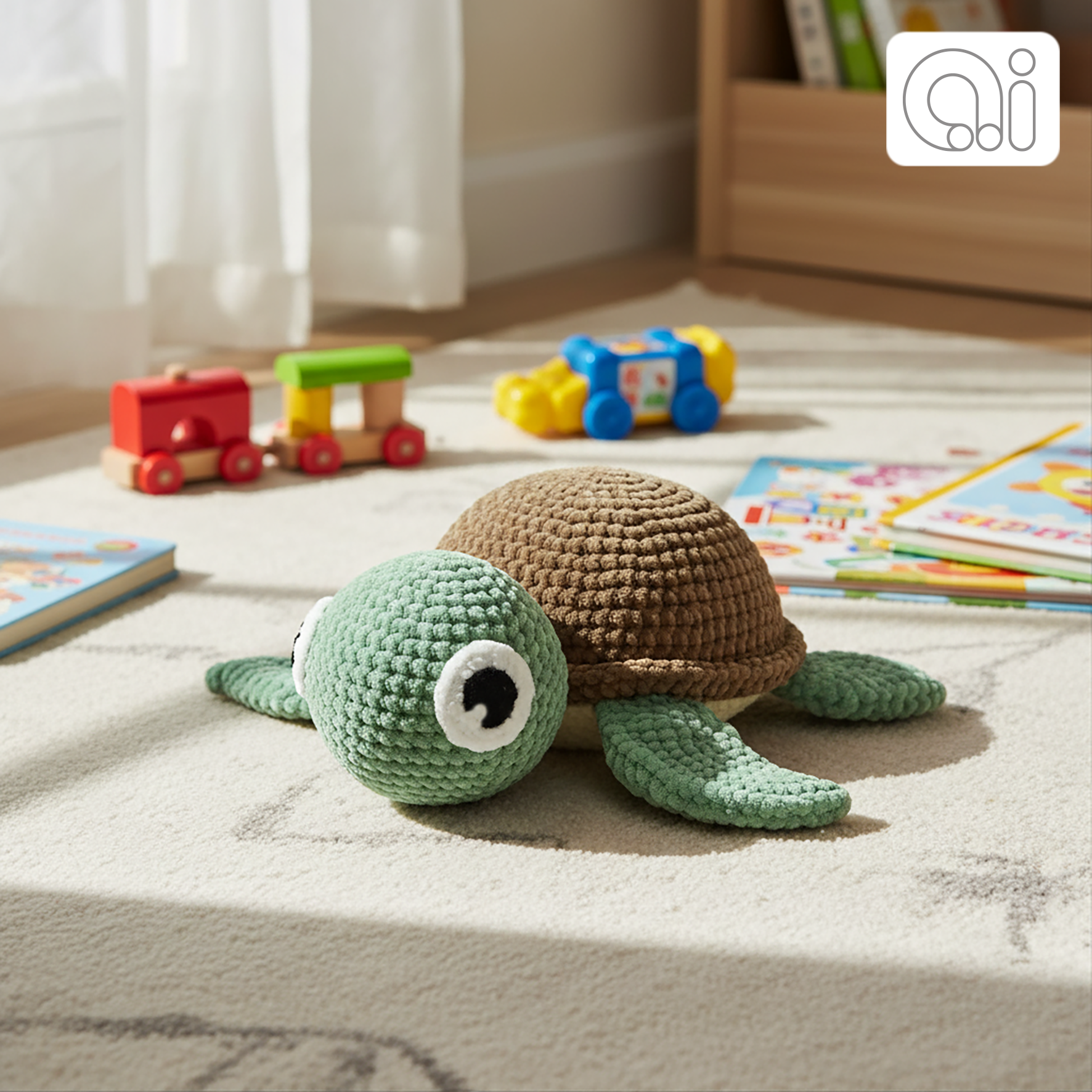 Denne søde skildpadde er hæklet af Chenillegarn og måler ca. 25 x 20 x 8,5 cm (lxbxh)
